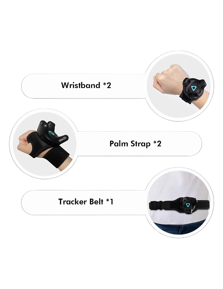 El Track Belt Vive Tracker incluye un cinturón de seguimiento, dos pulseras y dos correas de palma. Todos los componentes están fabricados con materiales de alta calidad: tela tejida no perforada que es suave al tacto y cómoda para largas sesiones de uso. La superficie de contacto de cuero repujado elástico mejora la fricción entre el rastreador y la correa, absorbiendo eficazmente vibraciones y ofreciendo un ajuste firme.