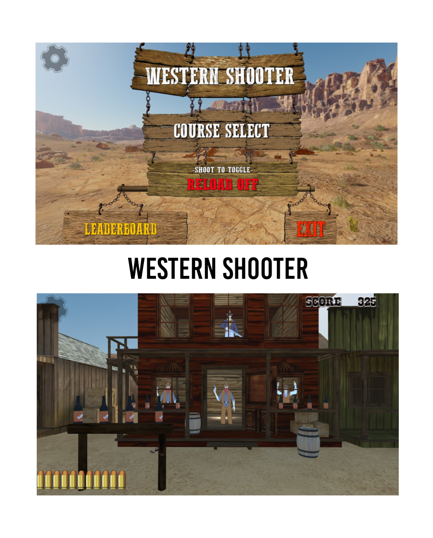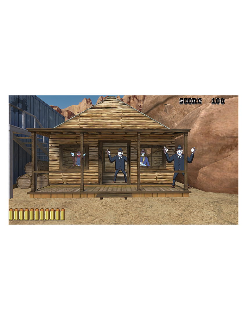 - Western Town – Recorre la ciudad de Dodge protegiendo a los ciudadanos de los forajidos. Gana puntos extra al acertar en insignias de sheriff, botellas y otros objetivos especiales.