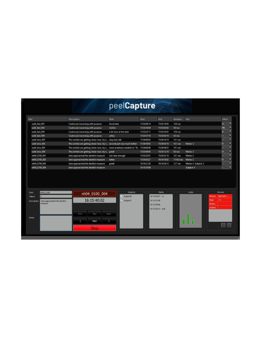 PeelCapture es una aplicación de escritorio diseñada para facilitar la gestión de dispositivos en platós de captura de movimientos y producciones virtuales. Esta herramienta permite una gestión fluida durante el rodaje, garantizando un control preciso sobre cada toma y dispositivo involucrado.